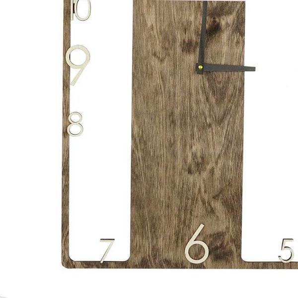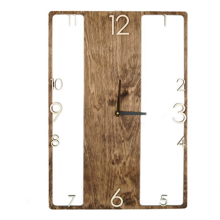 Moderne houten wandklok in rechthoekige vorm, heeft een geruisloos uurwerk en past perfect bij minimalistisch design of rustiek design. Hij ziet er prachtig uit als keukenwandklok aan je muur en past perfect in je huis of kantoor. Daarnaast is het horloge volledig stil, maakt het geen tikkend geluid, dus irriteert het niet als je een rustige en ontspannen omgeving wilt. Dit is een horloge met een uniek design dat er echt exclusief uitziet en iedereen zal aanspreken. Dit is een geweldige houten wandklok die donkerbruin is geverfd met houten figuren.