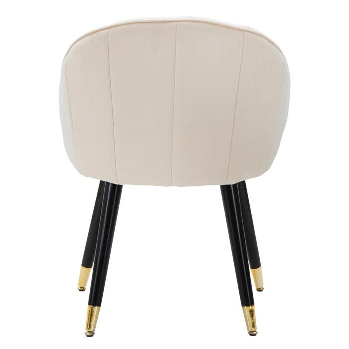 STOEL LOTY CREMA CM 57; Materiaal:pine hout, mdf, spons, fluweel en ijzer; Kleur: CREAM, GOUD EN ZWART Crèmekleurige gestoffeerde fluwelen stoel met houten poten en gouden metalen versieringen die een vleugje elegantie en verfijning geven.