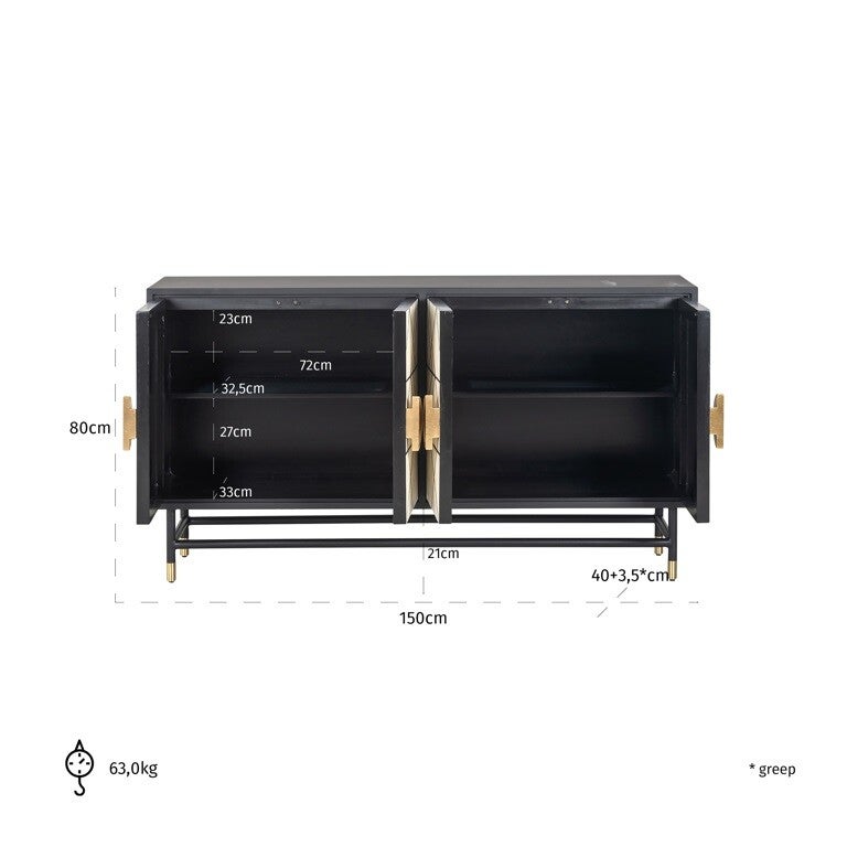 Hoogte product (cm) 80.0Breedte product (cm) 150.0Diepte product (cm) 40.0Materiaal animal bone *cruelty free, MDF, mango, iron, brass