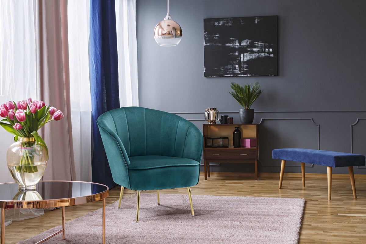 en de fluwelen bekleding geeft de fauteuil een chique uitstraling. Stevige stoelpoten van 100% ijzer maken het ontwerp compleet.