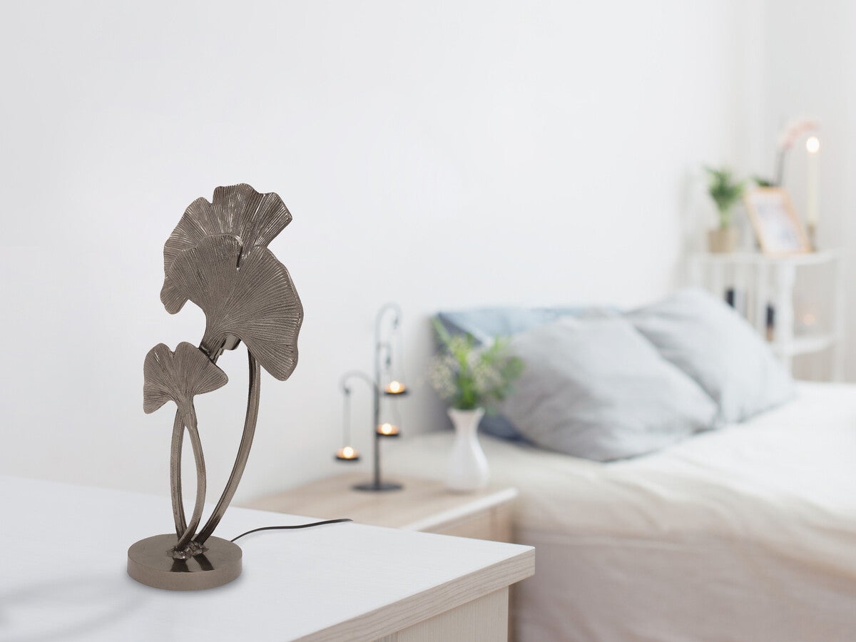 Bij deze decoratieve tafellamp brengen de welbekende ginkgobladeren niet alleen geluk, maar verfraaien ze ook elk interieur. De lamp in art-decostijl is handgemaakt van stevig metaal en geeft elke ruimte een Aziatische flair. Zonder ooit te vervagen, zorgen de filigraan gingko-bladeren voor bloemige tonen en worden vakkundig geënsceneerd door verborgen lichtbronnen. De ronde voet is glanzend gepolijst en reflecteert het warme licht op een stijlvolle manier. Overdag en vooral als 's avonds het licht aan is, is deze lamp een absolute eyecatcher en straalt moderne Aziatische glamour uit op de woonkamer, eettafel of dressoir.