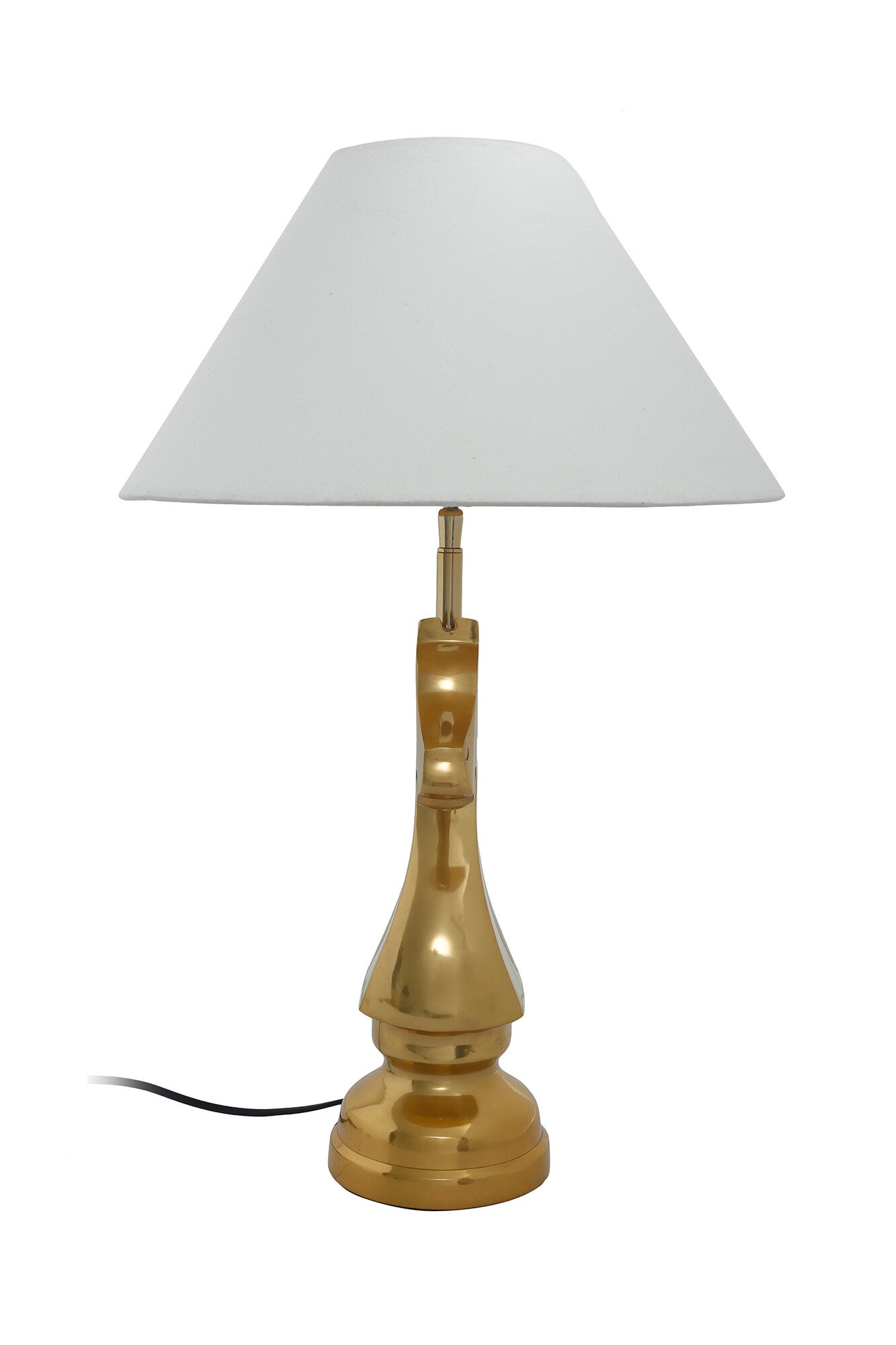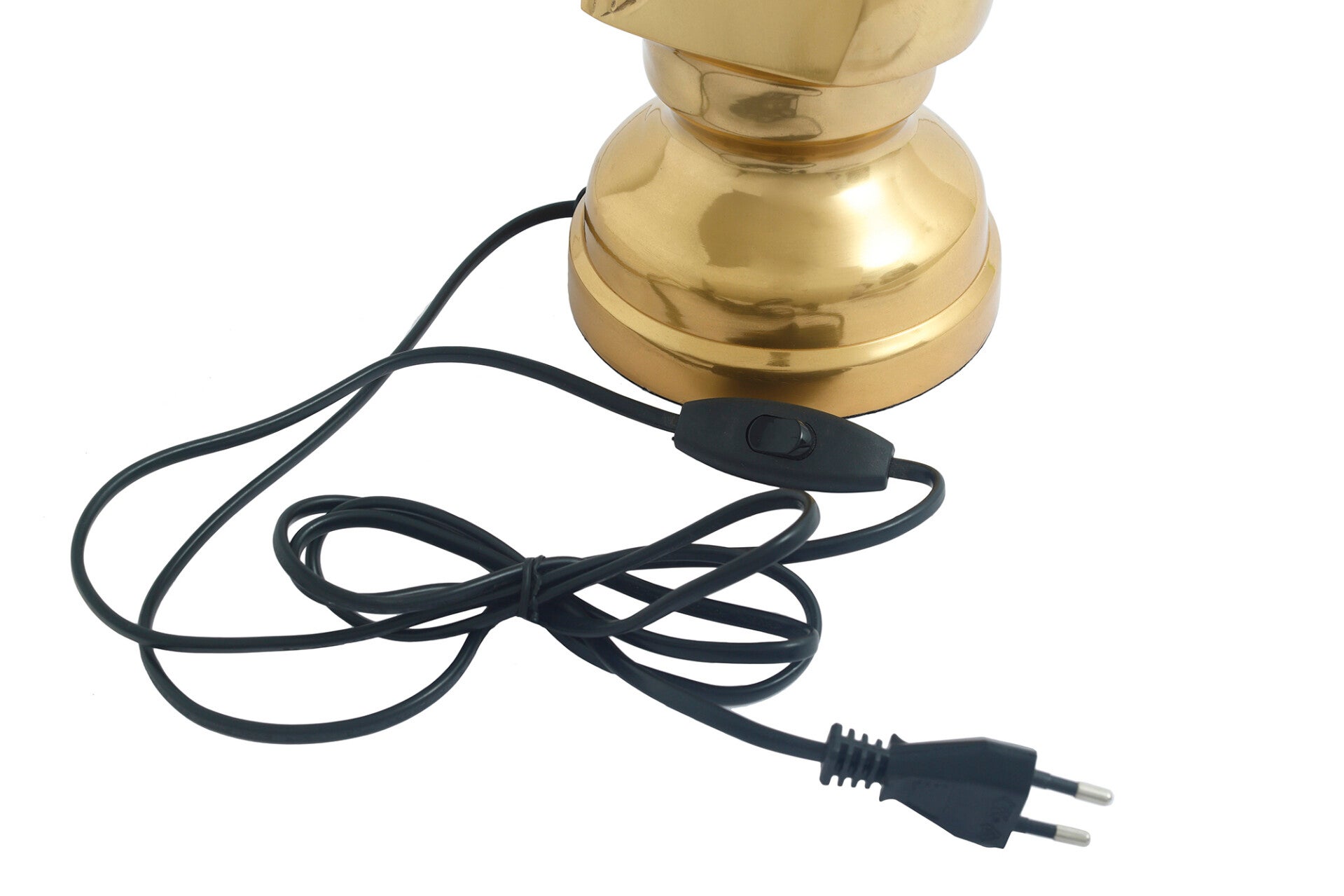 De focus ligt op de opvallende metalen voet, die is gebaseerd op het schaakstuk van het paard. De goudkleurige