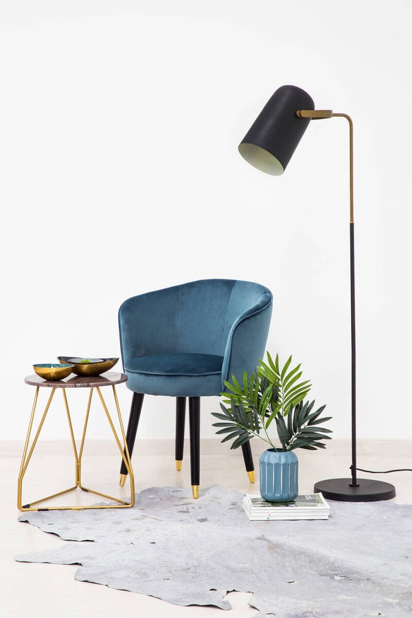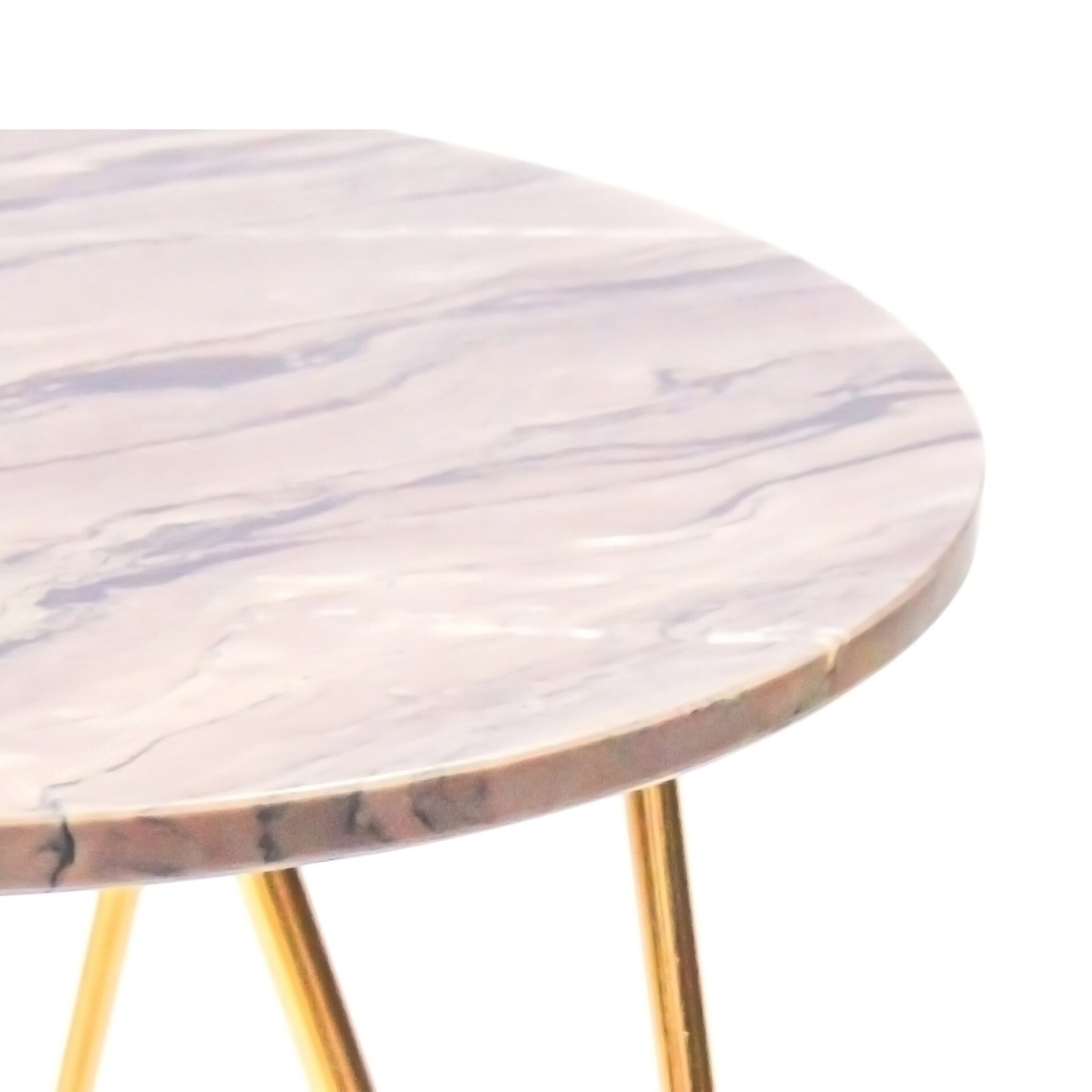 Metalen tafel met marmeren blad Het gouden frame en het marmeren tafelblad maken van deze bijzettafel een bijzonder elegant meubelstuk. De elementen van het frame, gemonteerd in een driehoekige vorm, en het ronde tafelblad passen goed bij elkaar en vormen een visueel aantrekkelijk totaalbeeld. Het gladde marmeren oppervlak kan gemakkelijk worden afgeveegd en is uiterst onderhoudsvriendelijk, zodat de tafel ook ideaal is voor gebruik in de keuken en eetkamer. Richt je ruimte opnieuw in met deze elegante bijzettafel en haal een stukje luxe in huis.