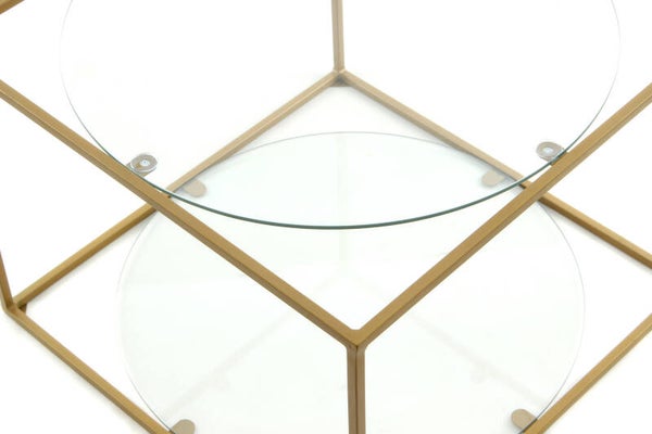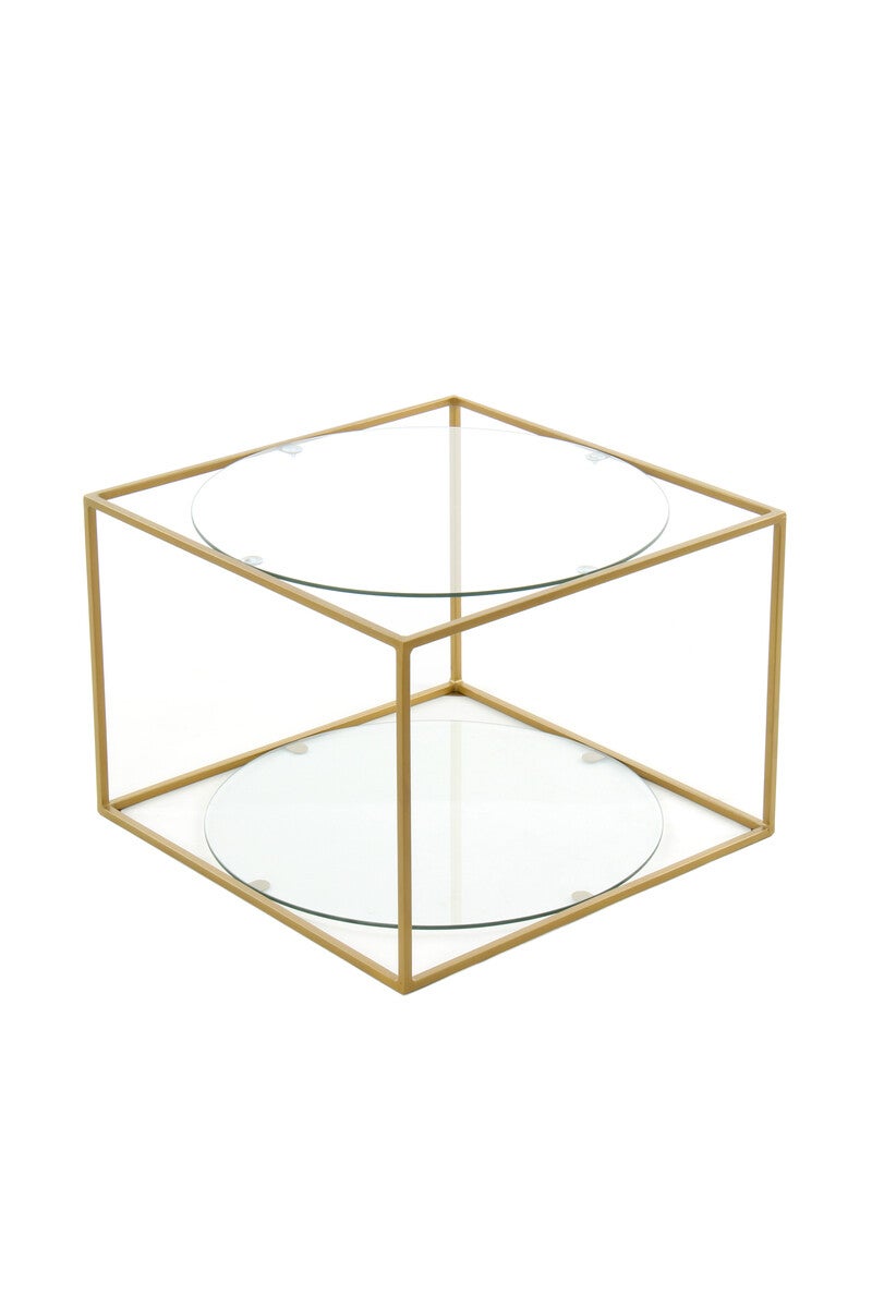 Kubus bijzettafel Bij deze bijzettafel zijn het frame en de tafelbladen in absolute harmonie met elkaar. Het open, kubusvormige metalen frame is niet alleen uitgerust met een tafelblad, maar ook met een extra voetplaat, zodat de bijzettafel comfortabel kan worden gebruikt als decoratief oppervlak en tegelijkertijd opbergruimte. De ronde vorm van de ingebedde platen handhaaft het concept van geometrische vormen en creëert tegelijkertijd een contrast met het hoekige frame. De minimalistische tafel komt bijzonder goed tot zijn recht in moderne, stijlvolle interieurs, maar ook klassieke interieurs kunnen met dit model een upgrade krijgen. Door het decoratieve design wordt de bijzettafel al snel een blikvanger in de kamer. De werkelijke kleur van de tafel kan afwijken van de foto's.