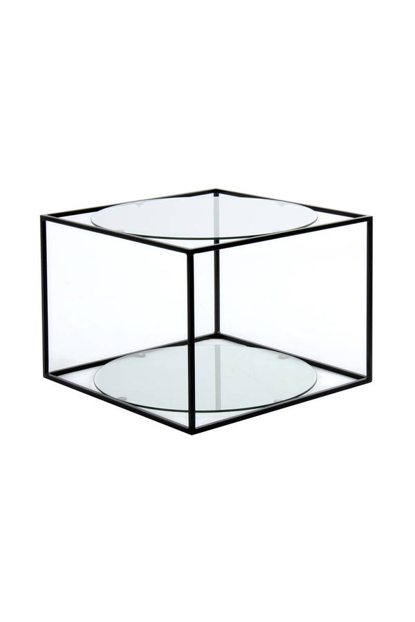 Kubus bijzettafel Bij deze bijzettafel zijn het frame en de tafelbladen in absolute harmonie met elkaar. Het open, kubusvormige metalen frame is niet alleen uitgerust met een tafelblad, maar ook met een extra voetplaat, zodat de bijzettafel comfortabel kan worden gebruikt als decoratief oppervlak en tegelijkertijd opbergruimte. De ronde vorm van de ingebedde platen handhaaft het concept van geometrische vormen en creëert tegelijkertijd een contrast met het hoekige frame. De minimalistische tafel komt bijzonder goed tot zijn recht in moderne, stijlvolle interieurs, maar ook klassieke interieurs kunnen met dit model een upgrade krijgen. Door het decoratieve design wordt de bijzettafel al snel een blikvanger in de kamer. De werkelijke kleur van de tafel kan afwijken van de foto's.