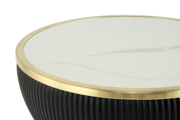 Bijzettafel met sinterstenen blad op ijzeren frame Deze combinatie van kunstzinnige bekleding in PU-stof en het gladde, stijlvolle blad van gesinterd steen op een robuust ijzeren frame maakt van deze bijzettafel een uitstekend decoratief woonaccessoire in elke woonkamer. Met zijn stevige ijzeren frame doet deze kleine tafel het uitstekend als opbergtafel voor glazen drankjes, salontafel of opbergtafel voor kleine planten. De combinatie van het gesinterde stenen blad, het ijzeren frame en de bekleding van PU-stof maakt de tafel bijzonder onderhoudsvriendelijk, wat de duurzaamheid en duurzaamheid garandeert. Of het nu buiten is op warme zomerdagen op het balkon of terras of het hele jaar door binnenshuis, deze bijzettafel is altijd een praktisch, stijlvol woonaccessoire.